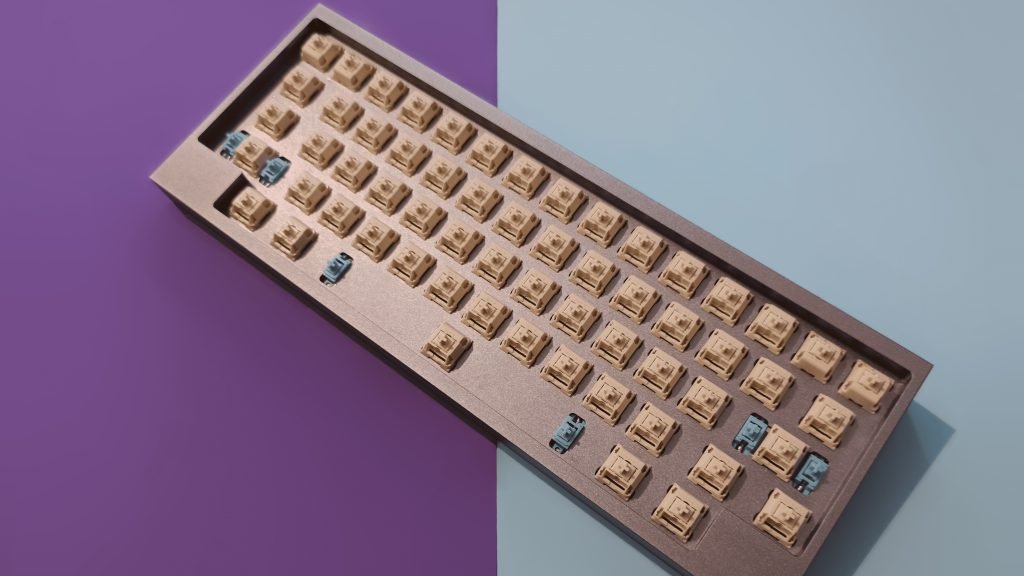 Latón (brass): Es un material muy ruidoso y más rígido que el aluminio, pero no tan rígido como el acero. Produce un sonido con una resonancia brillante más alto que el del acero. Es un material popular en muchos kits custom, bueno para switches lineales y táctiles (aunque incrementa su sonido), por lo tanto, no es recomendable para un teclado silencioso. Es bueno para PCB’s hotswap.
